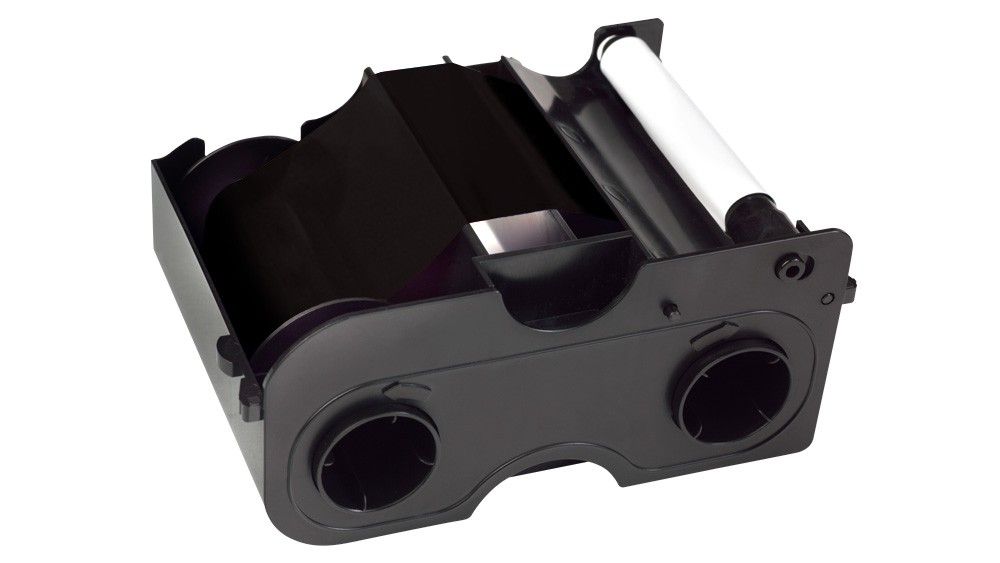 The Fargo 45101 premium black resin (K) ribbons are monochrome (1-color) ribbons. The ribbon is housed in an easy-to-use cartridge, which also includes a cleaning roller.