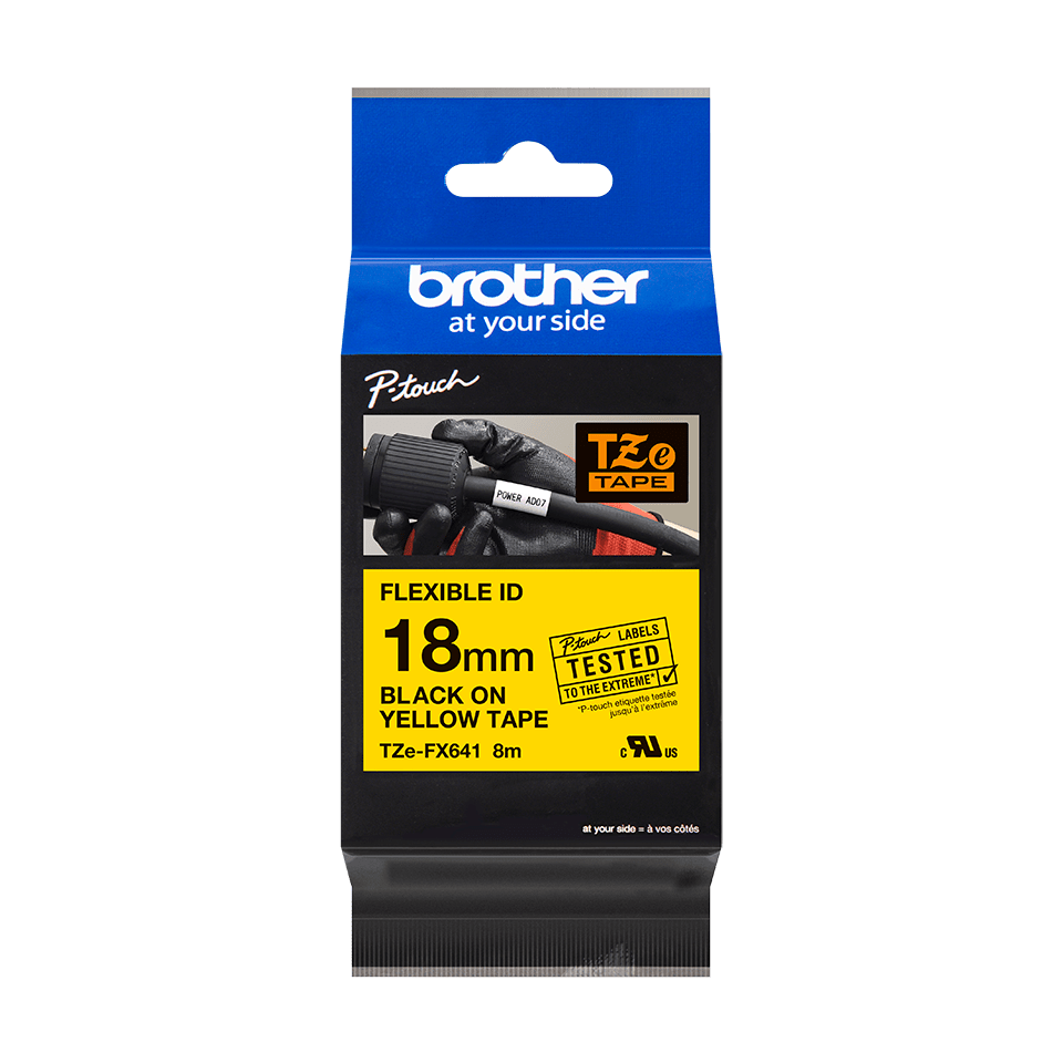Ideal for producing identification labels for cables, wires, PVC tubing or anything else cylinder-shaped, the special adhesive on the Brother TZe-FX641 black on Yellow labelling tape ensures that your important labels stay put for longer. Compatible with P-touch label printers that show the TZ or TZe logo on the tape cassette cover.